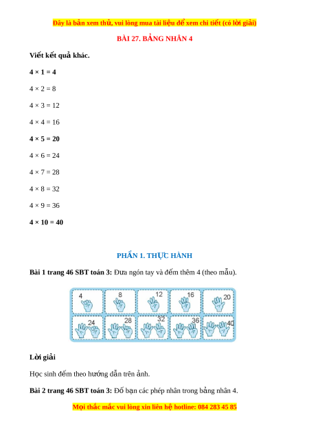 ệ đ ể xem chi ti t ế (có l i ờ gi i) ả BÀI 27. BẢNG NHÂN 4 Vi t ế k t ế qu k ả hác. 4 × 1 = 4 4 × 2 = 8 4 × 3 = 12 4 × 4 = 16 4 × 5 = 20 4 × 6 = 24 4 × 7 = 28 4 × 8 = 32 4 × 9 = 36 4 × 10 = 40 PHẦN 1. TH C Ự HÀNH