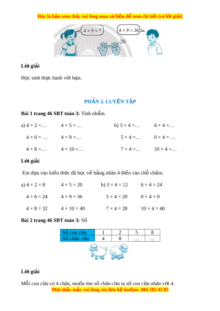 Bài 2 trang 46 SBT toán 3: Số Số con c u ừ 1 2 5 8 Số chân c u ừ 4 8 … … L i ờ giải Mỗi con c u có 4 chân, m ừ uốn tìm s chân c ố u ừ ta s con c ố u nhân v ừ i ớ 4. Mọi th c ắ m c