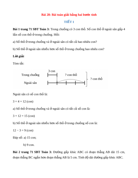 Bài 1 trang 71 SBT Toán 3: Trong chuồng có 3 con th . ỏ S ố con th ỏ ở ngoài sân g p ấ 4 lần số con th ỏ ở trong chuồng. H i ỏ : a) Số thỏ t ở rong chu ng và ồ ở ngoài sân có t t ấ c bao nhi ả êu con? b) Số thỏ ngoài ở sân nhi u ề h n s ơ t ố h ỏ t ở rong chu ng bao nhi ồ êu con? L i ờ giải Tóm t t ắ : Ngoài sân có số con th l ỏ à: 3 × 4 = 12 (con) a) Số thỏ t ở rong chu ng và ồ ở ngoài sân có t t ấ c s ả con l ố à: 3 + 12 = 15 (con) b) Số thỏ ngoài ở sân nhi u ề h n s ơ t ố h ỏ t ở rong chu ng s ồ con l ố à: 12 − 3 = 9 (con) Đáp số: a) 15 con; b) 9 con.