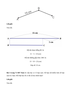 Bài 2 trang 71 SBT Toán 3: Đư ng ờ g p ấ khúc ABC có đo n ạ th ng ẳ AB dài 15 cm, đo n ạ th ng B ẳ C ng n ắ h n đo ơ n t ạ h ng ẳ AB là 5 cm. Tính đ dài ộ đư ng g ờ p khúc ấ ABC. L i ờ giải Tóm t t ắ : Độ dài đo n t ạ h ng ẳ BC là: 15 − 5 = 10 (cm) Đ dài ộ đư ng ờ g p khúc ấ ABC là: 15 + 10 = 25 (cm) Đáp số: 25 cm.
