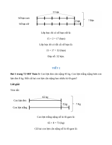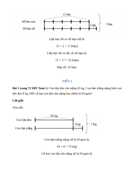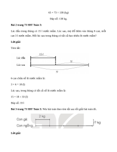Bài 1 trang 72 SBT Toán 3: Con l n ợ đen cân n ng ặ 65 kg. Con l n ợ tr ng ắ n ng ặ h n ơ con l n đen ợ 8 kg. H i ỏ cả hai con l n cân n ợ ng ặ bao nhiêu ki-lô-gam? L i ờ giải Tóm t t ắ : Con l n t ợ r ng n ắ ng ặ số ki-lô-gam là: 65 + 8 = 73 (kg) Cả hai con l n cân n ợ ng ặ số ki-lô-gam là: 65 + 73 = 138 (kg) Đáp số: 138 kg.