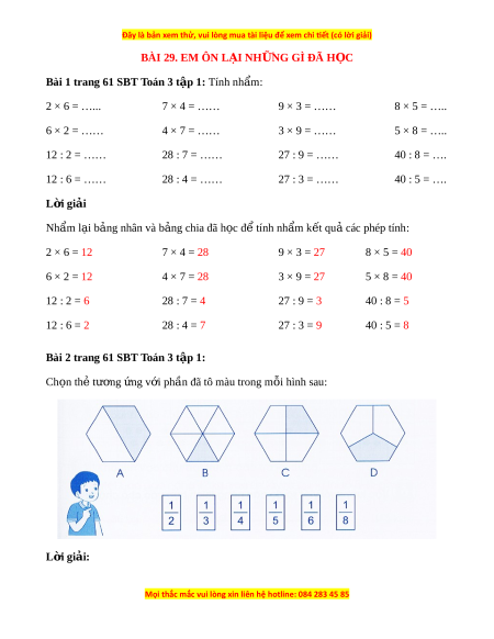 Bài 1 trang 61 SBT Toán 3 t p 1 ậ : Tính nhẩm: 2 × 6 = …... 7 × 4 = …… 9 × 3 = …… 8 × 5 = ….. 6 × 2 = …… 4 × 7 = …… 3 × 9 = …… 5 × 8 = ….. 12 : 2 = …… 28 : 7 = …… 27 : 9 = …… 40 : 8 = …. 12 : 6 = …… 28 : 4 = …… 27 : 3 = …… 40 : 5 = …. L i ờ giải Nhẩm l i ạ b ng ả nhân và b ng ả chia đã h c ọ đ t ể ính nh m ẩ k t ế qu các phép t ả ính: 2 × 6 = 12 7 × 4 = 28 9 × 3 = 27 8 × 5 = 40 6 × 2 = 12 4 × 7 = 28 3 × 9 = 27 5 × 8 = 40 12 : 2 = 6 28 : 7 = 4 27 : 9 = 3 40 : 8 = 5 12 : 6 = 2 28 : 4 = 7 27 : 3 = 9 40 : 5 = 8