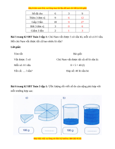 Bài 5 trang 62 SBT Toán 3 t p 1 ậ : Chú Nam v t ắ đư c 5 xô s ợ a bò, m ữ ỗi xô có 8 l s a. ữ H i ỏ chú Nam v t ắ đư c ợ t t ấ c bao nhi ả êu lít s a ữ ? L i ờ giải: Tóm t t ắ Bài gi i ả V t ắ đư c: ợ 5 xô Chú Nam v t ắ đư c ợ t t ấ c s ả l ố ít s a ữ là: Mỗi xô: 8 l s a ữ 8 × 5 = 40 (l) Tất c : ả … l s a? ữ Đáp số: 40 lít s a bò ữ