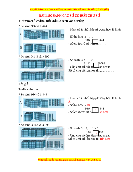 ữ số đầu tiên khác nhau: Số có chữ số l n h ớ n t ơ hì ……………. L i ờ giải Ta đi n nh ề s ư au: * So sánh 986 và 1 444 - Hình có ít kh i ố l p ậ phư ng ơ h n ơ là hình A - Số bé h n l ơ à 986 986 1 444 < - Số có ít ch s ữ ố h n ơ thì bé h n ơ * So sánh 3 143 và 3 996 - So sánh: 3 = 3, 1 > 0 3 143 3 096 > - C p ch ặ