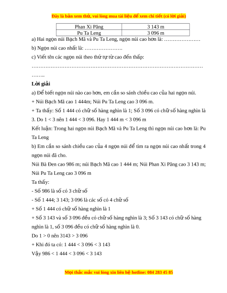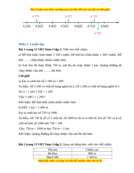 Bài 2 trang 13 VBT Toán 3 t p 2. ậ Quan sát b ng bên, vi ả t ế vào chỗ chấm Tên núi Chi u cao ề Bà Đen 986 m B ch M ạ ã 1 444 m M i