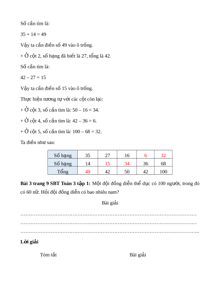 Bài 2 trang 9 SBT Toán 3 t p 1: ậ Số? Số h ng ạ 35 27 16 Số h ng ạ 14 36 68 Tổng 42 50 42 100 L i ờ giải Muốn tìm tổng, ta l y s ấ ố h ng c ạ ng ộ v i ớ s h ố ng. ạ Muốn tìm số h ng ạ ch a bi ư t ế , ta l y t ấ ng t ổ r đi ừ s h ố ng ạ đã bi t ế . + c Ở t ộ 1, số h ng ạ th nh ứ t ấ là 35, s h ố ng t ạ hứ hai là 14. Số cần tìm là: 35 + 14 = 49 V y ậ ta c n đi ầ n s ề ố 49 vào ô trống. + c Ở t ộ 2, số h ng ạ đã bi t ế là 27, t ng l ổ à 42. Số cần tìm là: 42 – 27 = 15 V y ậ ta c n đi ầ n s ề ố 15 vào ô trống. Th c hi ự n t ệ ư ng t ơ v ự i ớ các c t ộ còn l i ạ : + c Ở t ộ 3, số c n t ầ ìm là: 50 – 16 = 34. + c Ở t ộ 4, số c n t ầ ìm là: 42 – 36 = 6. + c Ở t ộ 5, số c n t ầ ìm là: 100 – 68 = 32. Ta đi n nh ề s ư au: Số h ng ạ 35 27 16 6 32 Số h ng ạ 14 15 34 36 68 Tổng 49 42 50 42 100