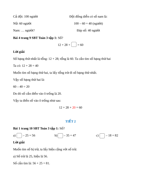 Bài 4 trang 9 SBT Toán 3 t p 1: ậ Số? 12 + 28 + = 60 L i ờ giải Số h ng t ạ h nh ứ