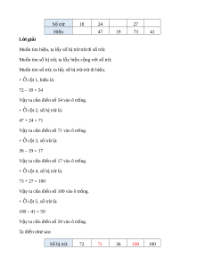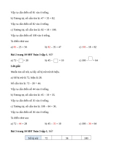 ự ố cần tìm là: 47 + 35 = 82. V y ậ ta c n đi ầ n s ề ố 82 vào ô trống. c) Tư ng t ơ , ự s c ố n t ầ ìm là: 82 + 18 = 100. V y ậ ta c n đi ầ n s ề ố 100 vào ô trống. Ta đi n nh ề s ư au: a) 81 – 25 = 56 b) 82 – 35 = 47 c) 100 – 18 = 82