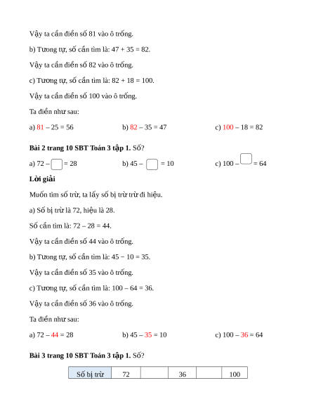 Bài 3 trang 10 SBT Toán 3 t p 1. ậ Số? Số bị trừ 72 36 100