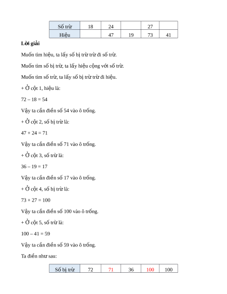 ự ố cần tìm là: 45 − 10 = 35. V y ậ ta c n đi ầ n s ề ố 35 vào ô trống. c) Tư ng t ơ , ự s c ố n t ầ ìm là: 100 – 64 = 36. V y ậ ta c n đi ầ n s ề ố 36 vào ô trống. Ta đi n nh ề s ư au: a) 72 – 44 = 28 b) 45 – 35 = 10 c) 100 – 36 = 64