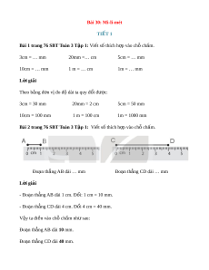 Bài 1 trang 76 SBT Toán 3 T p 1 ậ : Vi t ế số thích h p vào ợ ch ch ỗ m ấ . 3cm = … mm 20mm =… cm 5cm = … mm 10cm = … mm 1 m = … cm 1m = … mm L i ờ giải Theo b ng đ ả n ơ v đo đ ị ộ dài ta quy đ i ổ đư c: ợ 3cm = 30 mm 20mm = 2 cm 5cm = 50 mm 10cm = 100 mm 1 m = 100 cm 1m = 1000 mm