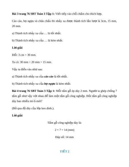 Bài 3 trang 76 SBT Toán 3 T p 1 ậ : Vi t ế ti p vào ch ế ỗ chấm cho thích h p. ợ Cào cào, bọ ng a ự và châu ch u ấ thi nh y ả xa đư c ợ thành tích l n ầ lư t ợ là 3cm, 15 mm, 20 mm. a) Thành tích nh y ả xa c a … l ủ à t t ố nh t ấ . b) Thành tích nh y ả xa c a … l ủ à kém nh t ấ . L i ờ giải Đổi: 3 cm = 30 mm.