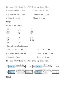 Bài 1 trang 77 SBT Toán 3 T p 1 ậ : Vi t ế số thích h p vào ợ ch ch ỗ m ấ . a) 150 mm + 400 mm = ... mm 45 mm + 2 mm = … mm b) 450 mm - 180 mm = … mm 72 mm – 34 mm = … mm c) 37 mm × 2 = … mm 72 mm : 3 = … mm L i ờ giải Đ t