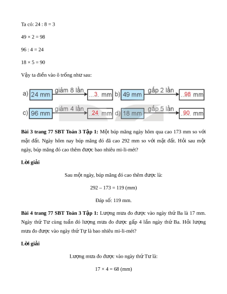 Bài 3 trang 77 SBT Toán 3 T p 1: ậ M t búp măng ngày hôm qua cao 173 mm so v iộ ớ