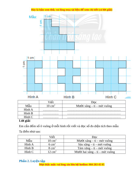 ế số ô vuông ở mỗi hình r i ồ vi t ế và đ c ọ s đo di ố n t ệ ích theo m u ẫ Ta đi n nh ề s ư au: Vi t ế Đ c ọ Mẫu 10 cm2 Mư i