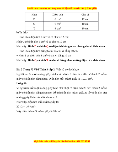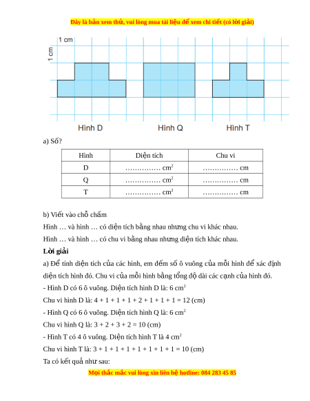ệ đ xe ể m chi ti t (c ế ó lời gi i ả ) a) Số? Hình Diện tích Chu vi D …………… cm2 …………… cm Q …………… cm2 …………… cm T …………… cm2 …………… cm b) Vi t ế vào chỗ chấm