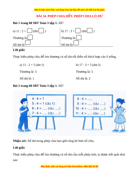 VBT Toán lớp 3 Bài 34 (Cánh diều): Phép chia hết. Phép chia có dư
