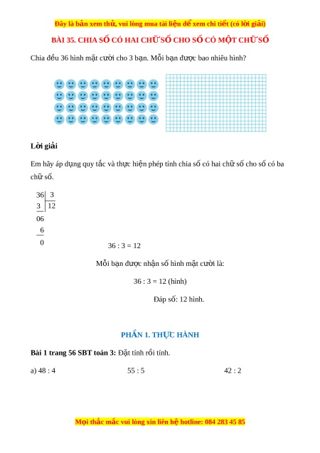 ệ đ ể xem chi ti t ế (có l i ờ gi i) ả BÀI 35. CHIA S C Ố Ó HAI CH S Ữ C Ố HO S C Ố Ó M T Ộ CH S Ữ Ố Chia đ u 36 hì ề nh m t ặ cư i ờ cho 3 b n. M ạ i ỗ b n ạ đư c ợ bao nhiêu hình? L i ờ giải Em hãy áp d ng quy t ụ c ắ và th c hi ự n phép t ệ ính chia s có ố hai ch s ữ cho s ố có ố ba chữ số. 36 3 3 12 06 6 0 36 : 3 = 12 Mỗi b n đ ạ ư c ợ nh n s ậ ố hình m t ặ cư i ờ là: 36 : 3 = 12 (hình) Đáp số: 12 hình. PHẦN 1. TH C Ự HÀNH