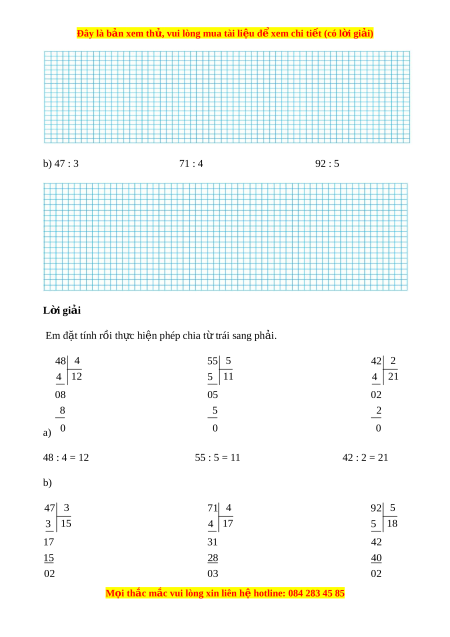 ệ đ ể xem chi ti t ế (có l i ờ gi i) ả b) 47 : 3 71 : 4 92 : 5 L i ờ giải Em đ t ặ tính r i ồ th c hi ự n phép chi ệ a t t ừ rái sang ph i ả . 48 4 55 5 42 2 4 12 5 11 4 21 08 05 02 8 5 2 a) 0 0 0 48 : 4 = 12 55 : 5 = 11 42 : 2 = 21 b) 47 3 71 4 92 5 3 15 4 17 5 18 17 31 42 15 28 40 02 03 02 Mọi th c ắ m c