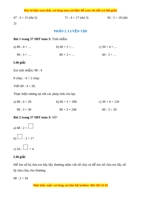 ệ đ ể xem chi ti t ế (có l i ờ gi i) ả 47 : 3 = 15 (d 2 ư ) 71 : 4 = 17 (d 3 ư ) 92 : 5 = 18 (dư 2) PHẦN 2. LUYỆN T P Ậ