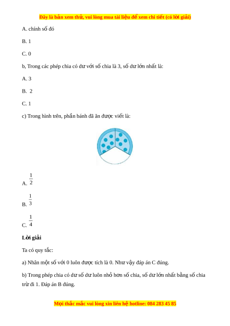 ệ đ ể xem chi ti t ế (có l i ờ gi i) ả A. chính số đo B. 1 C. 0 b, Trong cac phep chia co d v ư i ớ số chia là 3, s d ố l ư n nh ớ t â là: A. 3 B. 2 C. 1