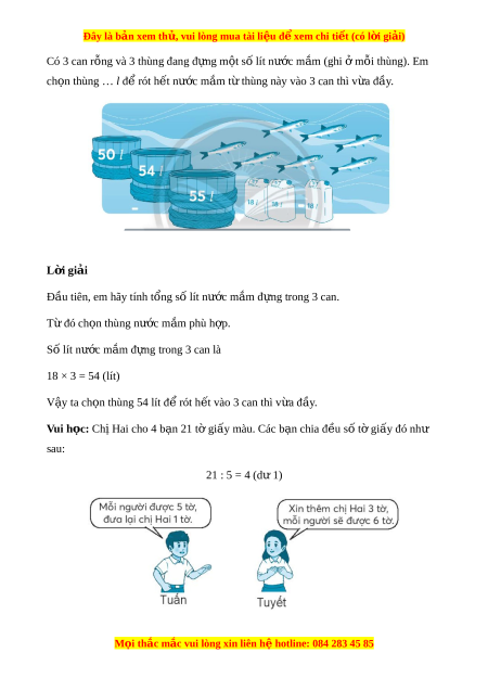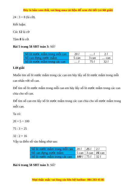 ắ trong cac can em hãy l y s â l ố ít nư c ớ m m ắ trong m i ô can nhân v i ớ số can. Đê tim số lít nư c ớ m m ắ trong m i ô can em hãy l y s â l ố ít nư c ớ m m ắ trong cac can chia cho số can. Đê tim số can em l y s â l ố ít nư c m ớ m ắ trong cac can chia cho s n ố ư c ớ m m ắ trong môi can. Ta co: 20 × 5 = 100 75 : 3 = 25 32 : 2 = 16 V y ậ ta đi n s ề ố vào b ng ả nh s ư au: Số lít nư c ớ m m ắ trong m i ô can 20 l 25 l 2 l Số can đ ng n ự ư c m ớ m ắ