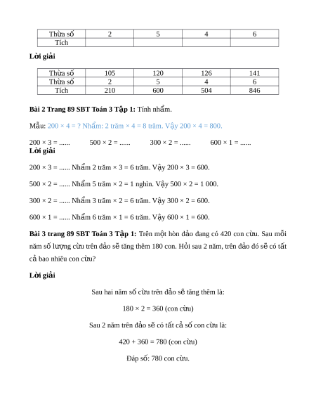 Bài 1 trang 89 SBT Toán 3 T p 1 ậ : Số? Th a ừ số 105 120 126 141 Th a ừ số 2 5 4 6 Tích L i ờ giải Th a ừ số 105 120 126 141 Th a ừ số 2 5 4 6 Tích 210 600 504 846