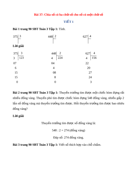 Bài 1 trang 90 SBT Toán 3 T p 1 ậ : Tính. 375 3 448 2 627 4 L i ờ giải 375 3 448 2 627 4 3 123 4 224 4 156 07 04 22 6 4 20 15 08 27 15 8 24 0 0 3