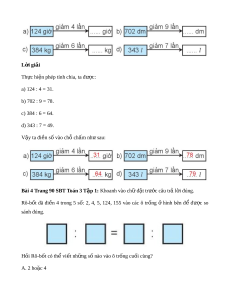 Bài 3 trang 90 SBT Toán 3 T p 1 ậ : Vi t ế số thích h p vào ợ ch ch ỗ m ấ . L i ờ giải Th c hi ự n phép t ệ ính chia, ta đư c: ợ a) 124 : 4 = 31. b) 702 : 9 = 78. c) 384 : 6 = 64. d) 343 : 7 = 49. V y ậ ta đi n s ề ố vào chỗ ch m ấ nh s ư au: