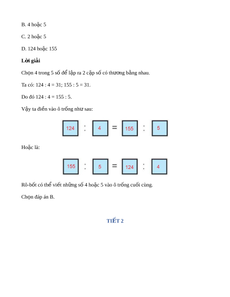 Ta có: 124 : 4 = 31; 155 : 5 = 31. Do đó 124 : 4 = 155 : 5. V y ậ ta đi n vào ô t ề rống như sau: Hoặc là: Rô-bốt có th vi ể t ế nh ng s ữ 4 ho ố c 5 vào ô t ặ r ng cu ố i ố cùng. Ch n ọ đáp án B. TI T Ế 2