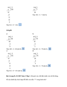 Bài 3 trang 91, 92 SBT Toán 3 T p 1 ậ Đ, S : ? a) b) 240 4 425 6 24 6 42 70 00 05 0 0 0 5 V y ậ 240 : 4 = 6 (d 0) ư . V y ậ 425 : 6 = 70 (d 5) ư . c) d)