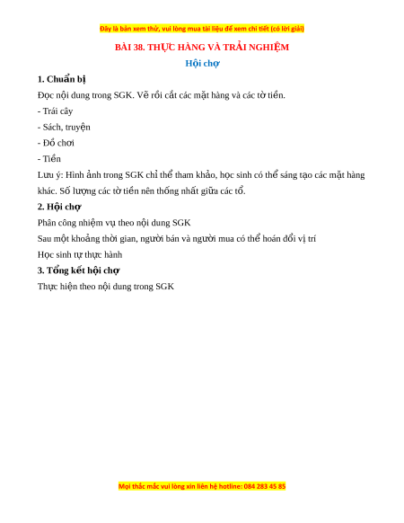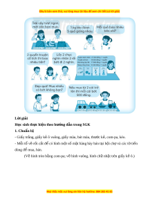 Ự HÀNG VÀ TRẢI NGHI M Ệ H i ộ chợ 1. Chuẩn bị Đ c ọ n i ộ dung trong SGK. V r ẽ i ồ c t ắ các m t ặ hàng và các t t ờ i n. ề - Trái cây - Sách, truy n ệ - Đồ ch i ơ - Ti n ề L u ý: ư Hình nh t ả rong SGK ch t ỉ h t ể ham kh o, h ả c ọ sinh có th s ể áng t o ạ các m t ặ hàng khác. Số lư ng các ợ t t ờ i n nên t ề h ng nh ố t ấ gi a ữ các t . ổ 2. H i ộ chợ Phân công nhi m ệ v t ụ heo n i ộ dung SGK Sau m t ộ kho ng ả th i ờ gian, ngư i ờ bán và ngư i ờ mua có th hoán ể đ i ổ v t ị rí H c ọ sinh t t ự h c ự hành 3. T ng k ổ t ế h i ộ chợ Th c hi ự n t ệ heo n i ộ dung trong SGK