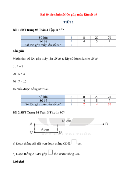 Bài 1 SBT trang 98 Toán 3 T p 1 ậ : Số? Số l n ớ 8 8 20 70 Số bé 4 4 5 7 Số l n g ớ ấp mấy lần số bé? 2 L i ờ giải Muốn tính số l n ớ g p m ấ y l ấ n s ầ ố bé, ta l y s ấ ố l n chi ớ a cho s bé. ố 8 : 4 = 2 20 : 5 = 4 70 : 7 = 10 Ta đi n đ ề ư c ợ b ng nh ả ư sau: Số l n ớ 8 8 20 70 Số bé 4 4 5 7 Số l n g ớ ấp mấy lần số bé? 2 2 4 10