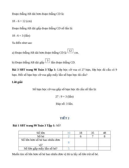 Bài 3 SBT trang 98 Toán 3 T p ậ 1: L p ớ h c ọ cờ vua có 27 b n, ạ l p ớ h c ọ đá c u ầ có 9 b n. ạ H i ỏ số b n ạ h c c ọ ờ vua g p m ấ y l ấ n s ầ ố b n h ạ c ọ đá c u? ầ L i ờ giải Số b n h ạ c ọ c vua g ờ p s ấ ố b n ạ h c đá c ọ u s ầ l ố n l ầ à: 27 : 9 = 3 (l n) ầ Đáp số: 3 lần. TI T Ế 2