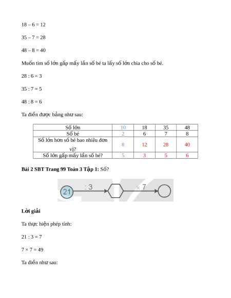 Bài 2 SBT Trang 99 Toán 3 T p 1 ậ : Số? L i ờ giải Ta th c hi ự ện phép tính: 21 : 3 = 7 7 × 7 = 49 Ta đi n nh ề s ư au: