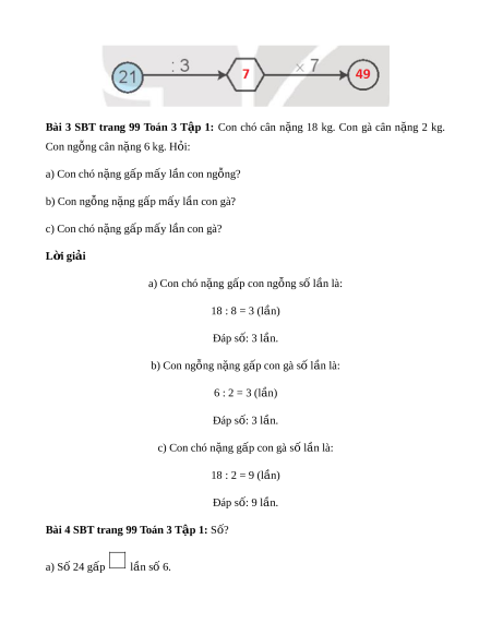 ậ 1: Con chó cân n ng ặ 18 kg. Con gà cân n ng ặ 2 kg. Con ngỗng cân n ng 6 kg. H ặ i ỏ : a) Con chó n ng g ặ p m ấ y l ấ n con ng ầ ỗng? b) Con ngỗng n ng g ặ p m ấ y l ấ n con gà? ầ c) Con chó n ng g ặ p m ấ y l ấ n con gà? ầ L i ờ giải a) Con chó n ng ặ g p con ấ ng ng s ỗ l ố n l ầ à: 18 : 8 = 3 (l n) ầ Đáp số: 3 lần. b) Con ngỗng n ng ặ g p con gà s ấ l ố n l ầ à: 6 : 2 = 3 (l n) ầ Đáp số: 3 lần. c) Con chó n ng g ặ p con gà s ấ ố l n l ầ à: 18 : 2 = 9 (l n) ầ Đáp số: 9 lần.