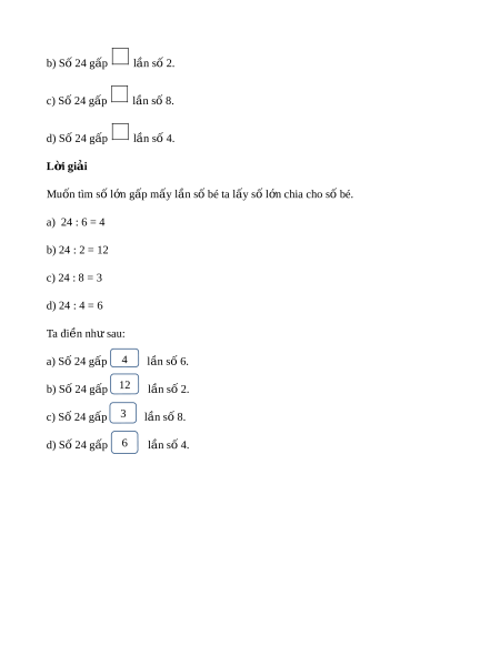 Bài 4 SBT trang 99 Toán 3 T p 1 ậ : Số? a) Số 24 gấp lần số 6.