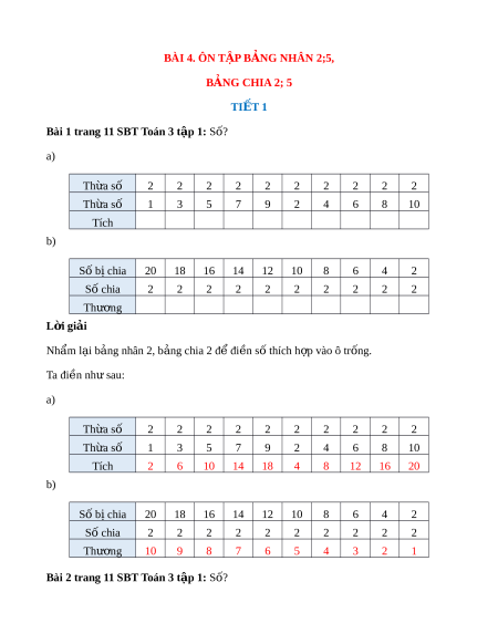Bài 1 trang 11 SBT Toán 3 t p 1 ậ : Số? a) Th a s ừ ố 2 2 2 2 2 2 2 2 2 2 Th a s ừ ố 1 3 5 7 9 2 4 6 8 10 Tích b) Số bị chia 20 18 16 14 12 10 8 6 4 2 Số chia 2 2 2 2 2 2 2 2 2 2 Thư ng ơ L i ờ giải Nhẩm l i ạ b ng ả nhân 2, b ng ả chia 2 đ đi ể n s ề t ố hích h p vào ợ ô tr ng. ố Ta đi n nh ề s ư au: a) Th a s ừ ố 2 2 2 2 2 2 2 2 2 2 Th a s ừ ố 1 3 5 7 9 2 4 6 8 10 Tích 2 6 10 14 18 4 8 12 16 20 b) Số bị chia 20 18 16 14 12 10 8 6 4 2 Số chia 2 2 2 2 2 2 2 2 2 2 Thư ng ơ 10 9 8 7 6 5 4 3 2 1