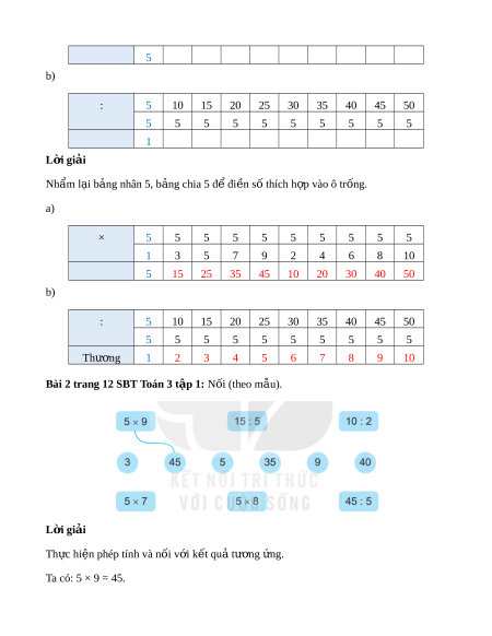 Bài 1 trang 12 SBT Toán 3 t p 1: ậ Số? a) × 5 5 5 5 5 5 5 5 5 5 1 3 5 7 9 2 4 6 8 10 5 b) : 5 10 15 20 25 30 35 40 45 50 5 5 5 5 5 5 5 5 5 5 1 L i ờ giải Nhẩm l i ạ b ng ả nhân 5, b ng ả chia 5 đ đi ể n s ề t ố hích h p vào ợ ô tr ng. ố a) × 5 5 5 5 5 5 5 5 5 5 1 3 5 7 9 2 4 6 8 10 5 15 25 35 45 10 20 30 40 50 b) : 5 10 15 20 25 30 35 40 45 50 5 5 5 5 5 5 5 5 5 5 Thư ng ơ 1 2 3 4 5 6 7 8 9 10