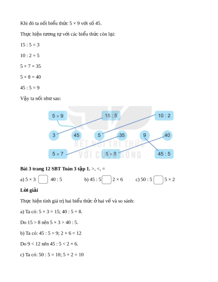 Bài 2 trang 12 SBT Toán 3 t p 1: ậ N i ố (theo mẫu). L i ờ giải Th c hi ự n phép t ệ ính và n i ố v i ớ k t ế qu t ả ư ng ơ ng. ứ Ta có: 5 × 9 = 45.