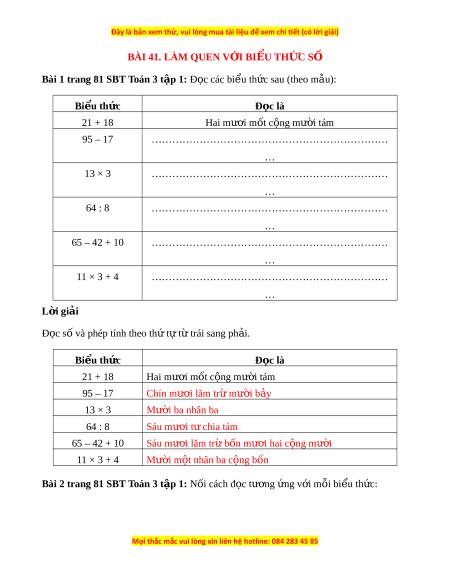 Bài 1 trang 81 SBT Toán 3 t p 1: ậ Đ c các ọ bi u t ể h c s ứ au (theo m u) ẫ : Bi u t ể h c ứ Đ c ọ là 21 + 18 Hai mư i ơ mốt c ng m ộ ư i ờ tám 95 – 17