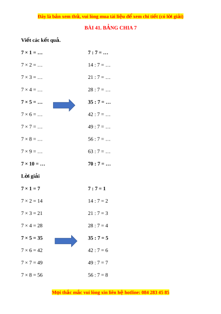 ệ đ ể xem chi ti t ế (có l i ờ gi i) ả BÀI 41. BẢNG CHIA 7 Vi t ế các k t ế quả. 7 × 1 = … 7 : 7 = … 7 × 2 = … 14 : 7 = … 7 × 3 = … 21 : 7 = … 7 × 4 = … 28 : 7 = … 7 × 5 = … 35 : 7 = … 7 × 6 = … 42 : 7 = … 7 × 7 = … 49 : 7 = … 7 × 8 = … 56 : 7 = … 7 × 9 = … 63 : 7 = … 7 × 10 = … 70 : 7 = … L i ờ giải 7 × 1 = 7 7 : 7 = 1 7 × 2 = 14 14 : 7 = 2 7 × 3 = 21 21 : 7 = 3 7 × 4 = 28 28 : 7 = 4 7 × 5 = 35 35 : 7 = 5 7 × 6 = 42 42 : 7 = 6 7 × 7 = 49 49 : 7 = 7 7 × 8 = 56 56 : 7 = 8 Mọi th c ắ m c