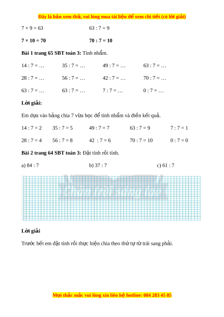 Bài 2 trang 64 SBT toán 3: Đ t ặ tính rồi tính. a) 84 : 7 b) 37 : 7 c) 61 : 7 L i ờ giải Trư c h ớ t ế em đ t ặ tính rồi th c hi ự n chi ệ a theo th t ứ t ự t ừ rái sang ph i ả . Mọi th c ắ m c