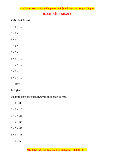 ệ đ ể xem chi ti t ế (có l i ờ gi i) ả BÀI 42. BẢNG NHÂN 8 Vi t ế các k t ế quả 8 × 1 = … 8 × 2 = … 8 × 3 = … 8 × 4 = … 8 × 5 = … 8 × 6 = … 8 × 7 = … 8 × 8 = … 8 × 9 = … 8 × 10 = … L i ờ giải Em th c hi ự n phép t ệ ính d a vào phép nhân ự đã h c. ọ 8 × 1 = 8 8 × 2 = 16 8 × 3 = 24 8 × 4 = 32 8 × 5 = 40 8 × 6 = 48 8 × 7 = 56 Mọi th c ắ m c
