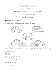 Bài 3 trang 106 SBT Toán 3: Khối l p ớ Ba c a ủ m t ộ trư ng ờ ti u ể h c ọ có 7 l p, ớ m i ỗ l p ớ có 31 h c ọ sinh và 1 l p ớ có 34 h c ọ sinh. H i ỏ kh i ố l p ớ Ba c a ủ trư ng ờ đó có t t ấ c ả bao nhiêu h c ọ sinh? L i ờ giải 7 l p có ớ tất cả số h c s ọ inh là: 31 × 7 = 217 (h c ọ sinh) Khối l p B ớ a c a t ủ rư ng đó có t ờ ất cả số h c s ọ inh là: 217 + 34 = 251 (h c ọ sinh) Đáp số: 251 h c ọ sinh.