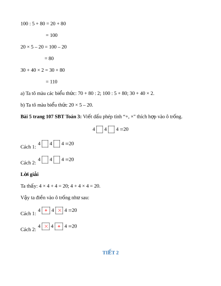 ứ 70 + 80 : 2; 100 : 5 + 80; 30 + 40 × 2. b) Ta tô màu bi u t ể h c ứ 20 × 5 – 20.