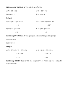 Bài 1 trang 107 SBT Toán 3: Tính giá tr c ị a bi ủ u t ể h c. ứ a) 75 – (68 – 23) c) 67 + (56 + 44) b) 8 × (63 : 7) d) 42 : (2 × 3) L i ờ giải