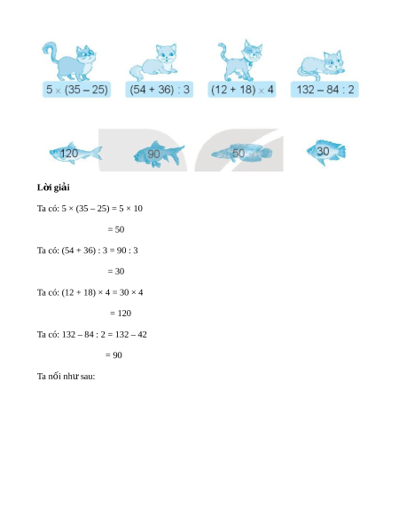 Ta có: 20 × 3 + 30 = 60 + 30 = 90 70 + 80 : 2 = 70 + 40 = 110 100 : 5 + 80 = 20 + 80 = 100 20 × 5 – 20 = 100 – 20 = 80 30 + 40 × 2 = 30 + 80 = 110 a) Ta tô màu các bi u t ể h c: