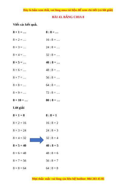 ệ đ ể xem chi ti t ế (có l i ờ gi i) ả BÀI 43. BẢNG CHIA 8 Vi t ế các k t ế quả. 8 × 1 = … 8 : 8 = … 8 × 2 = … 16 : 8 = … 8 × 3 = … 24 : 8 = … 8 × 4 = … 32 : 8 = … 8 × 5 = … 40 : 8 = … 8 × 6 = … 48 : 8 = … 8 × 7 = … 56 : 8 = … 8 × 8 = … 64 : 8 = … 8 × 9 = … 72 : 8 = … 8 × 10 = … 80 : 8 = … L i ờ giải 8 × 1 = 8 8 : 8 = 1 8 × 2 = 16 16 : 8 = 2 8 × 3 = 24 24 : 8 = 3 8 × 4 = 32 32 : 8 = 4 8 × 5 = 40 40 : 8 = 5 8 × 6 = 48 48 : 8 = 6 8 × 7 = 56 56 : 8 = 7 8 × 8 = 64 64 : 8 = 8 Mọi th c ắ m c
