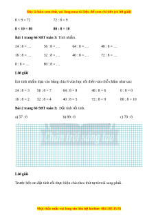 Bài 1 trang 66 SBT toán 3: Tính nh m ẩ . 24 : 8 = … 56 : 8 = … 64 : 8 = … 48 : 8 = … 16 : 8 = … 32 : 8 = … 40 : 8 = … 72 : 8 = … 0 : 8 = … 80 : 8 = … L i ờ giải Em tính nh m ẩ d a ự vào b ng chi ả a 8 v a ừ h c r ọ i ồ đi n vào ề ch ch ỗ m ấ nh s ư au: 24 : 8 = 3 56 : 8 = 7 64 : 8 = 8 48 : 8 = 6 0 : 8 = 0 16 : 8 = 2 32 : 8 = 4 40 : 8 = 5 72 : 8 = 9 80 : 8 = 10
